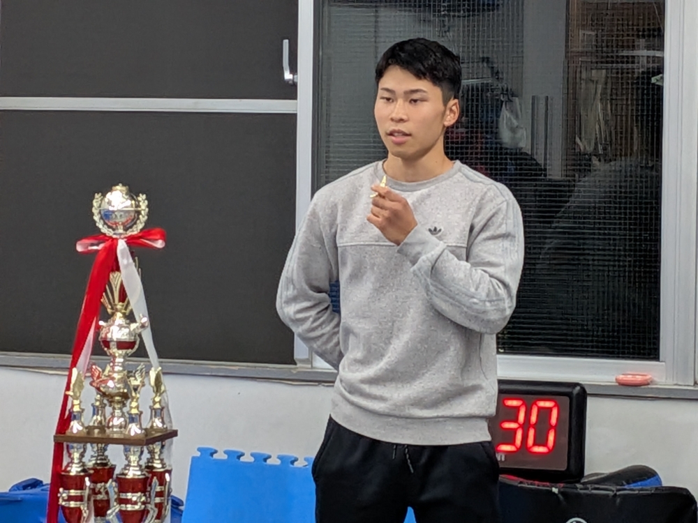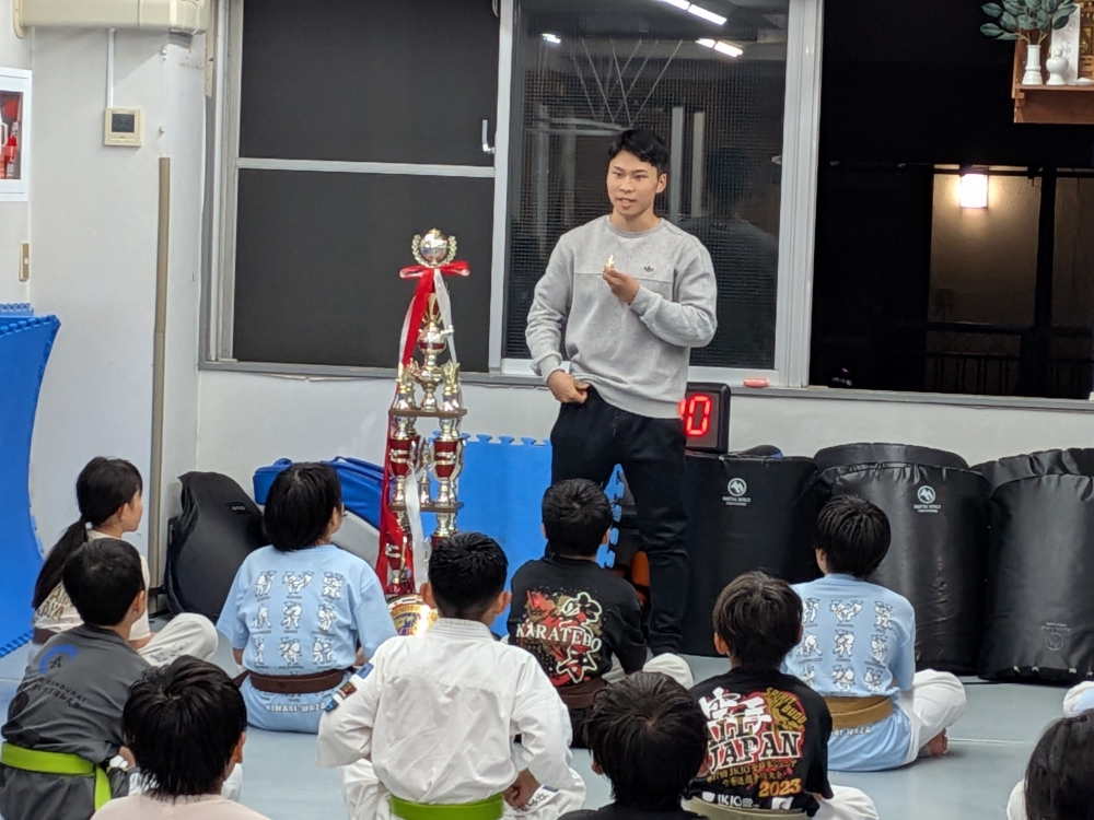 これまで関わってくださった方々、応援してくれた道場生、親御さんに感謝の気持ちを述べ、試合の感想を少年部に話してくれました。