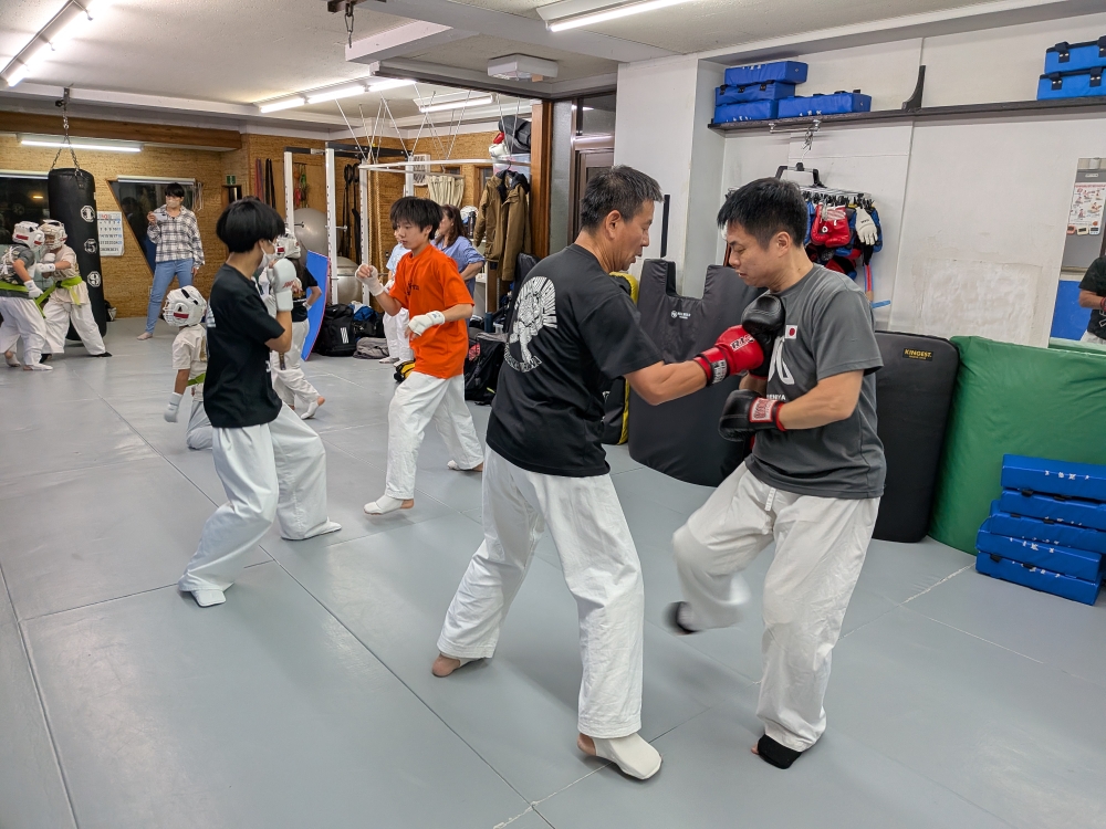 このクラスでは前半は組手のための基本テクニックの打ち込みをして、後半はライトスパーリングをするという内容です。